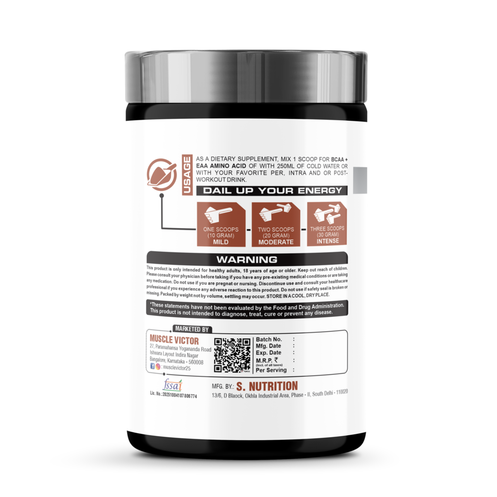 BCAAs—Leucine, Isoleucine, and Valine—play a vital role in muscle protein synthesis, helping to build lean muscle mass, reduce muscle breakdown, and fight workout fatigue. Leucine triggers muscle growth, while Isoleucine and Valine support endurance and energy production, allowing you to train harder and longer. When combined with EAAs, which include all nine essential amino acids the body cannot produce on its own, this formula ensures optimal muscle repair and faster recovery.